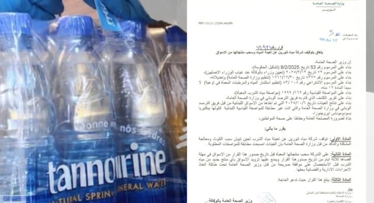 ويأتي هذا الإجراء في إطار حرص الوزارة على حماية صحة المواطنين وضمان جودة المياه المعبأة المتداولة في الأسواق. كما وجّهت الوزارة الجهات المعنية والبلديات والموزعين إلى وقف بيع عبوات “تنورين” مؤقتًا، إلى حين صدور نتائج التحقيق والفحوص المخبرية النهائية.