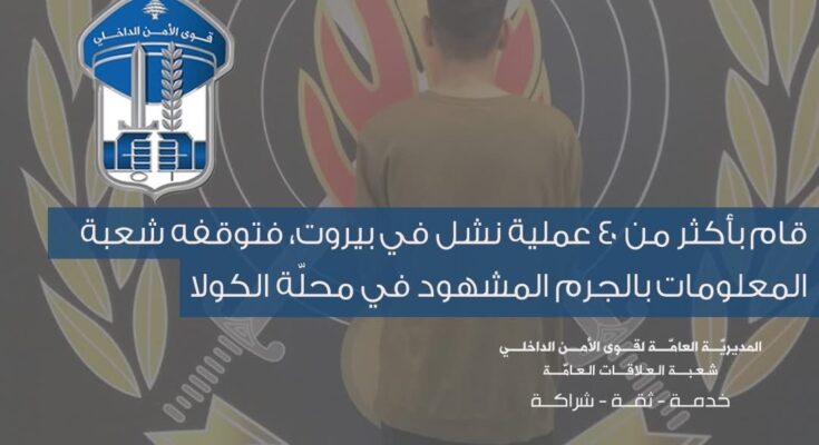 بتاريخ 08- 12- 2025 وبعد عملية رصد ومراقبة دقيقة، تمكّنت إحدى دوريات شعبة المعلومات من توقيفه بالجرم المشهود في محلّة الكولا أثناء محاولته نشل أحد المواطنين. بالتحقيق معه، اعترف بما نُسِبَ إليه لجهة إقدامه على تنفيذ أكثر من /40/ عملية نشل في العديد من مناطق بيروت منها: الكولا، الجناح، والمدينة الرياضية، حيث كان يقوم بنشل هواتف خلوية وحقائب ضحاياه، وسرقة محتواها وبيعها.