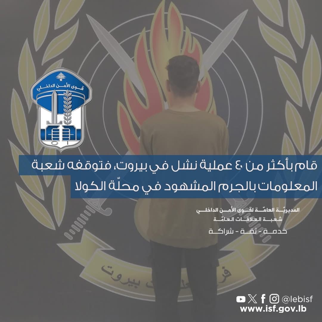 “في إطار المتابعة اليومية التي تقوم بها قطعات قوى الأمن الداخلي لمكافحة عمليات السرقة والنشل في مختلف المناطق اللبنانية وتوقيف مرتكبيها، توافرت معطيات حول قيام مجهول بتنفيذ عمليات نشل في عدّة مناطق من محافظة بيروت.