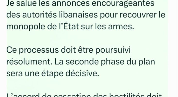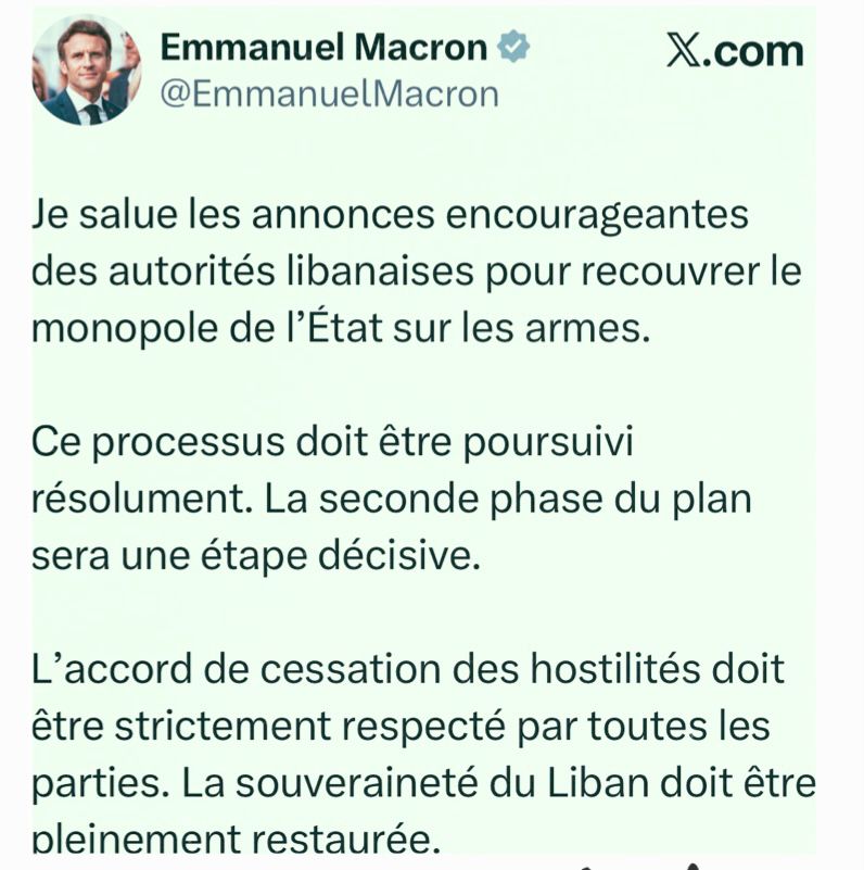 وزعت السفارة الفرنسية في لبنان تغريدة للرئيس الفرنسي ايمانويل ماكرون عبر منصة “اكس” جاء فيها: “أُرحب بالتصربحات المُشجعة الصادرة عن السلطات اللبنانية بشأن استعادة حصرية الدولة للسلاح.