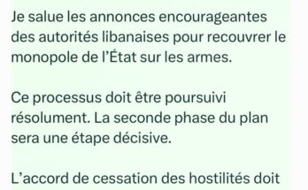 وزعت السفارة الفرنسية في لبنان تغريدة للرئيس الفرنسي ايمانويل ماكرون عبر منصة “اكس” جاء فيها: “أُرحب بالتصربحات المُشجعة الصادرة عن السلطات اللبنانية بشأن استعادة حصرية الدولة للسلاح. يجب المضيّ قُدماً …